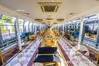 Внутреннее убранство корабля потрясает великолепием и особым шиком стиля “неоклассика”. Вместительный зал-ресторан, расположенный на нижней палубе, отделан стеклом, натуральным деревом и мрамором. Огромные панорамные окна теплохода River Palace, изготовленные из гнутого итальянского стекла, открывают изумительный вид на достопримечательности Москвы. Роскошный вид залу-ресторану придают люстры с позолотой, выполненные из горного хрусталя, шелковая обивка эксклюзивных предметов мебели, изысканные портьеры и стильные аксессуары. Пол покрыт бежевым мрамором.